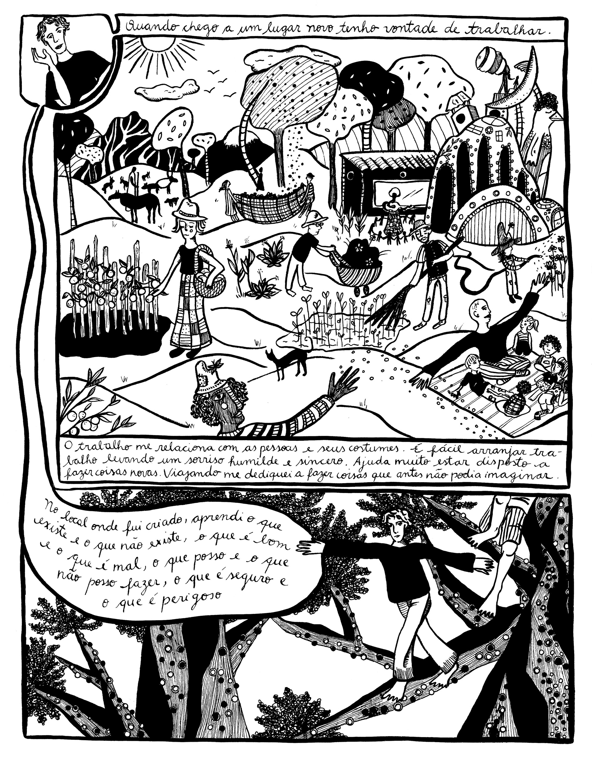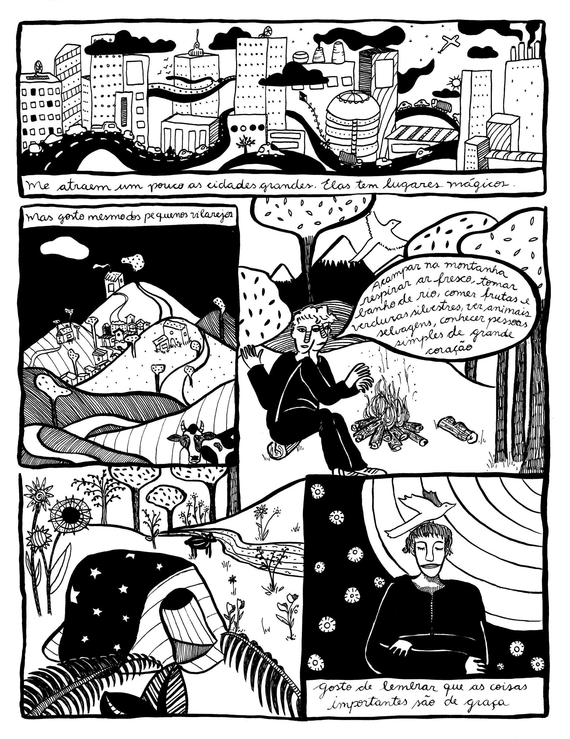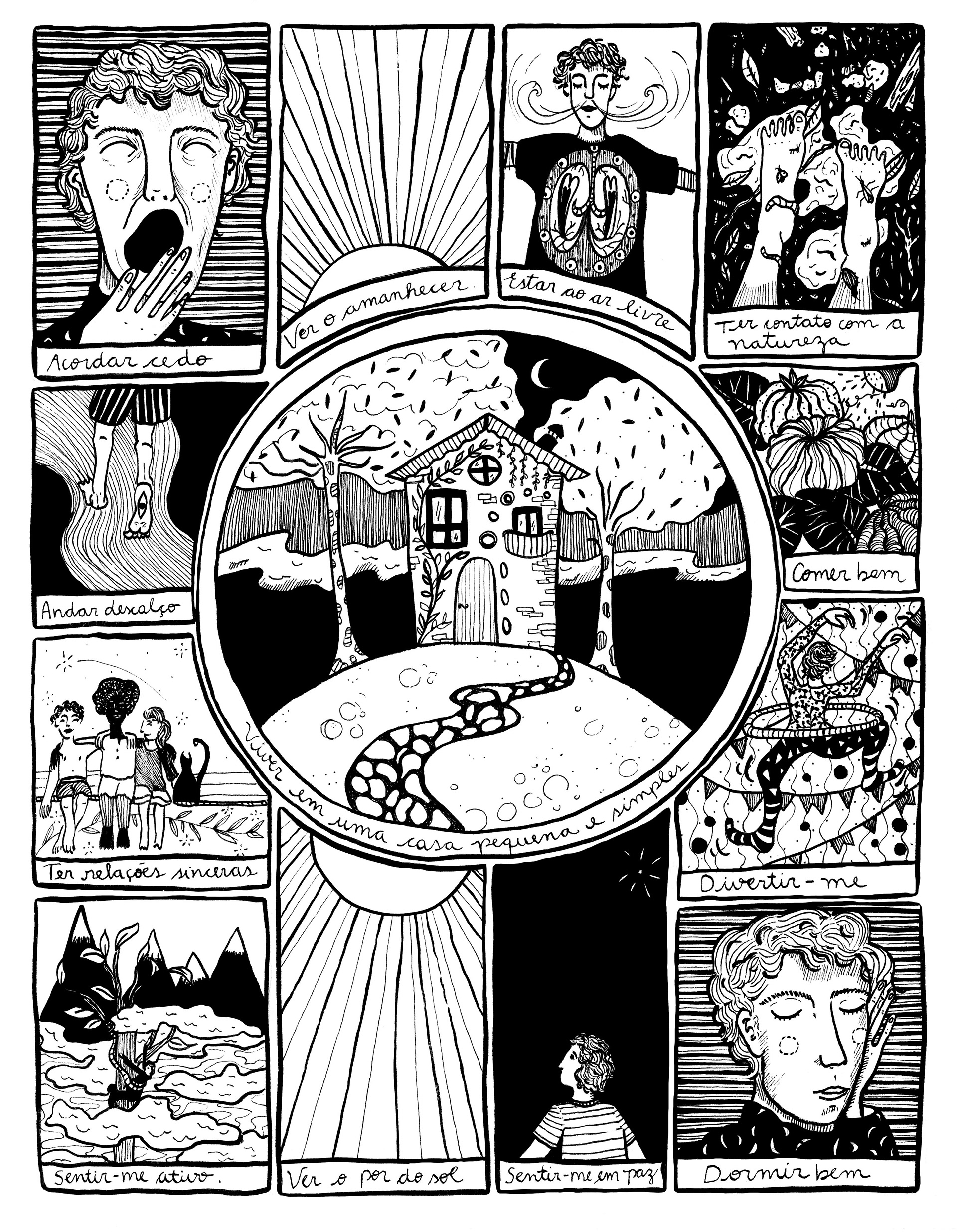 Projeto colaborativo | História em quadrinhos feita com desenhos em nanquim, ilustrando o texto autobiográfico de Bruno Verdino, “Gosto de Andar Simples”.